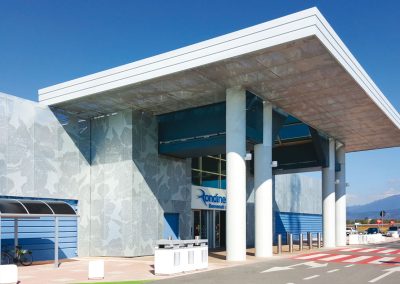 Il progetto prevede una risistemazione complessiva degli esterni attraverso la riorganizzazione degli stalli di sosta e viabilità, segnaletica di cortesia, la realizzazione di nuovi ingressi con nuove pensiline aggettanti; una rivisitazione complessiva delle facciate mediante un nuovo rivestimento con pannelli in lamiera forata a disegno con pattern “Primavera”, nuovi colori ed insegne.